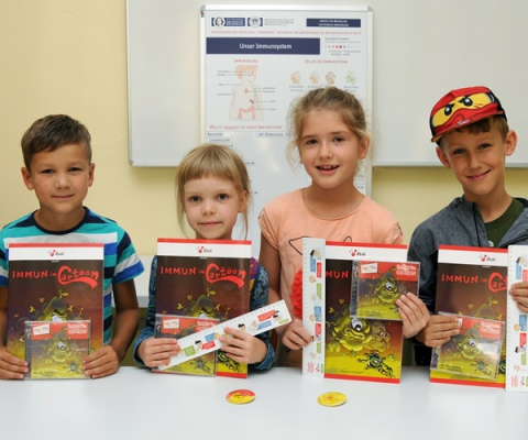 Impressions of the campus holiday for kids by the CRC 854. On July the 5th and 12th 2018, science-hungry young researchers discovered the world of immune cells. They had lots of fun competing in the immune cell quiz, making buttons, isolating DNA from strawberries and visiting a working research lab. PhD students and staff members of the SFB demonstrated the world of the immune system to the junior researchers.